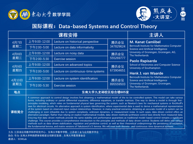 熊庆来大讲堂147期:2026. 04. 07~2026. 04. 10 - 国际课程:Data - based Systems and Control Theory